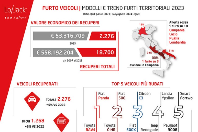 Cresce il numero delle vetture rubate ogni giorno sulle strade italiane e diminuisce, invece, la percentuale di ritrovamento. Il 2023 ha fatto segnare un aumento del fenomeno pari al 5% rispetto all’anno precedente. L’allarme emerge dall’analisi ‘Stolen Vehicle Recovery 2024’, curata dall’Osservatorio di LoJack, la società americana attiva nei servizi telematici e nel recupero di veicoli rubati.