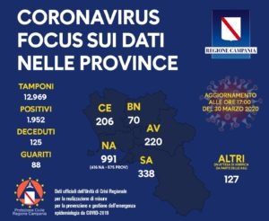 L’unità di crisi della Regione Campania ha comunicato che nella giornata di oggi sono pervenuti i seguenti dati: ospedale Cotugno di Napoli: sono stati esaminati 357 tamponi di cui 76 positivi al Coronavirus; ospedale Ruggi di Salerno: sono stati esaminati 194 tamponi di cui 20 positivi; ospedale Sant’Anna di Caserta: sono stati esaminati 88 tamponi di cui 3 positivi; ospedale Moscati di Aversa: sono stati esaminati 190 tamponi di cui 15 positivi; ospedale Moscati di Avellino: sono stati esaminati 113 tamponi di cui 12 positivi; azienda universitaria Federico II: sono stati esaminati 56 tamponi di cui 1 positivo; Istituto Zooprofilattico Sperimentale del Mezzogiorno: sono stati esaminati 106 tamponi di cui 59 positivi; ospedale di Nola: sono stati esaminati 186 tamponi di cui 14 positivi. I tamponi effettuati oggi sono 1290, di cui 200 positivi. I contagiati da Coronavirus in Campania salgono a 1952, su un totale di 12911 test.