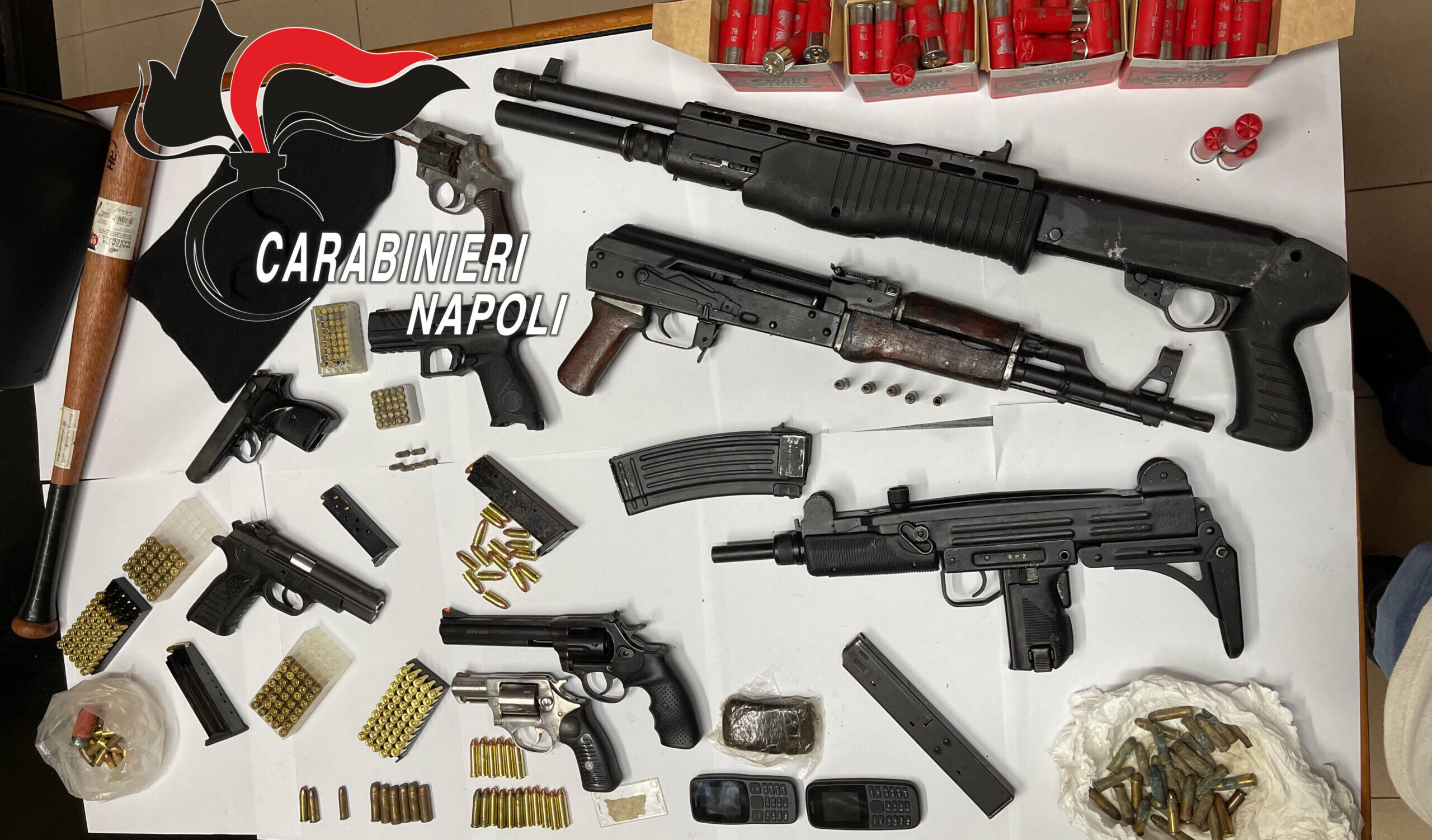 L’operazione è stata condotta dai militari della tenenza di Casalnuovo, che durante una perquisizione domiciliare hanno rinvenuto un vero arsenale: tra le armi sequestrate figurano una pistola a tamburo calibro .22, una .357 Magnum, una Beretta APX, una Tanfoglio calibro 9×21 e una semiautomatica calibro 7.65. Oltre alle armi corte, sono stati trovati anche un mitra Norico AK calibro 5,56, un secondo mitra calibro 9 e un fucile a pompa Franchi Spas-12, noto anche per essere stato utilizzato nel film Terminator.
