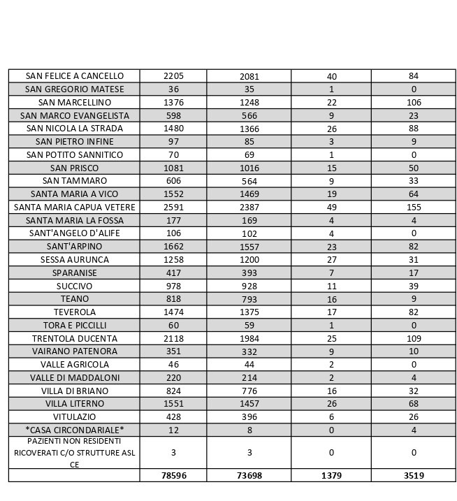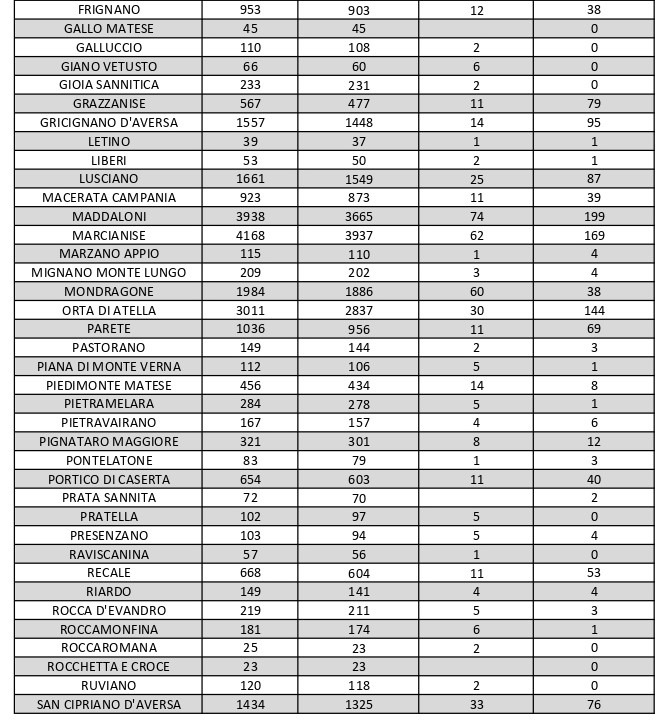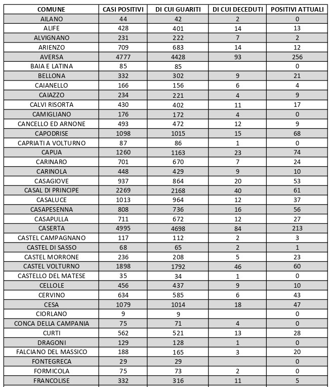 La città più colpita di tutta la provincia risulta essere Aversa con 256 contagiati. Seguono: Caserta con 213 contagiati, Maddaloni 199, Marcianise con 169 contagiati, Santa M. C. Vetere con 155, Orta di Atella 144, Trentola Ducenta 109, San Marcellino con 106, Gricignano con 95. A seguire l’elenco riportato.