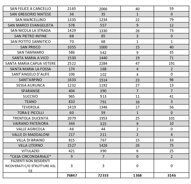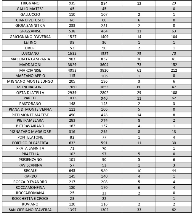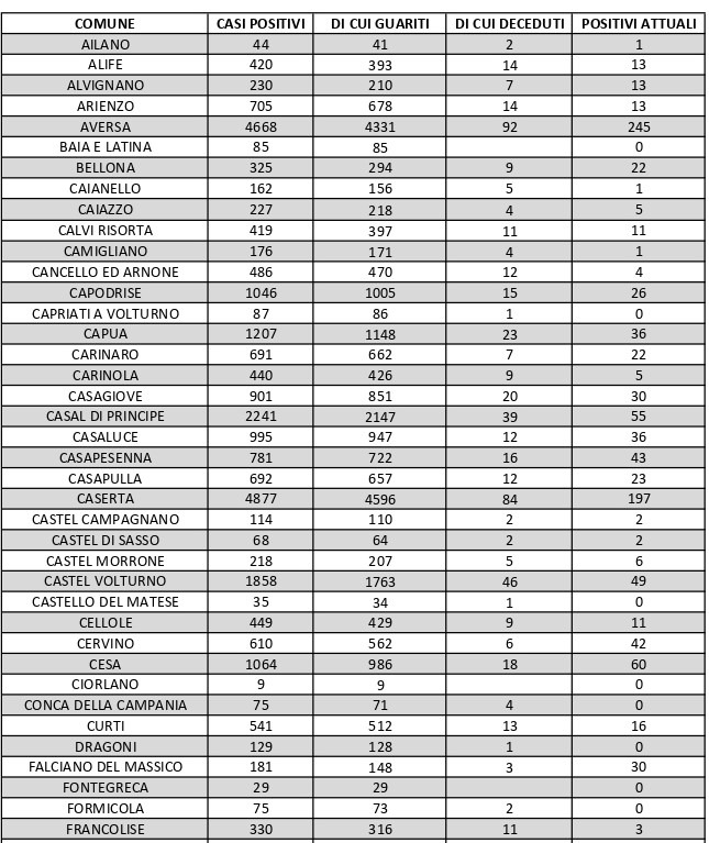 La città più colpita di tutta la provincia risulta essere Aversa con 245 contagiati. Seguono: Marcianise con 212 contagiati, Caserta con 197 contagiati, Santa M. C. Vetere con 191, Maddaloni 152, Orta di Atella 108, Gricignano con 104, Trentola Ducenta 101, Sant’Arpino con 96, San Marcellino con 79, Villa Literno con 75, San Nicola La Strada con 73, Santa Maria a Vico con 71, Lusciano con 70. A seguire l’elenco riportato.