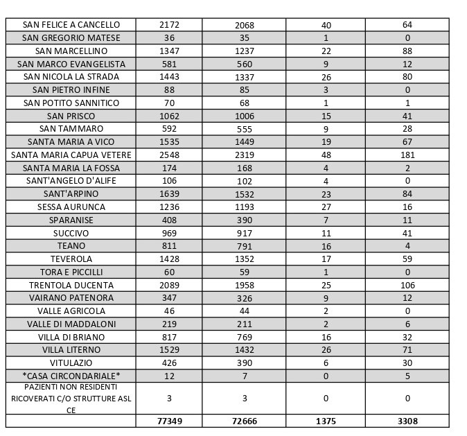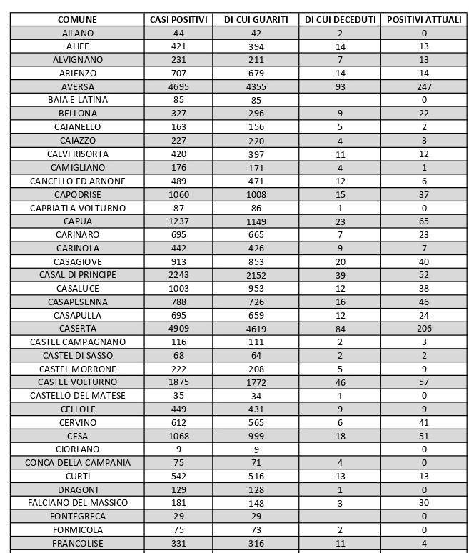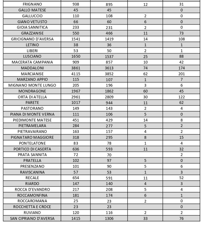 La città più colpita di tutta la provincia risulta essere Aversa con 247 contagiati. Seguono: Caserta con 206 contagiati, Marcianise con 201 contagiati, Santa M. C. Vetere con 181, Maddaloni con 174, Gricignano 108, Trentola Ducenta 106, Villa Literno con 71, Orta di Atella 122, Sant’Arpino con 99, Maddaloni 98, Gricignano con 97, San Marcellino e Lusciano con 88, San Nicola La Strada con 80. A seguire l’elenco riportato.