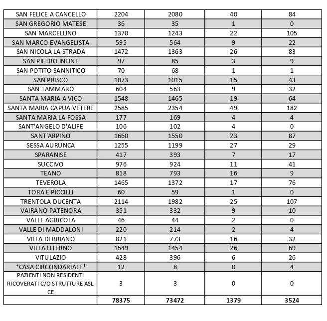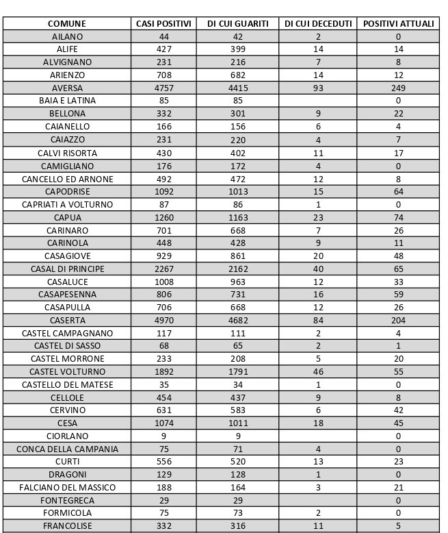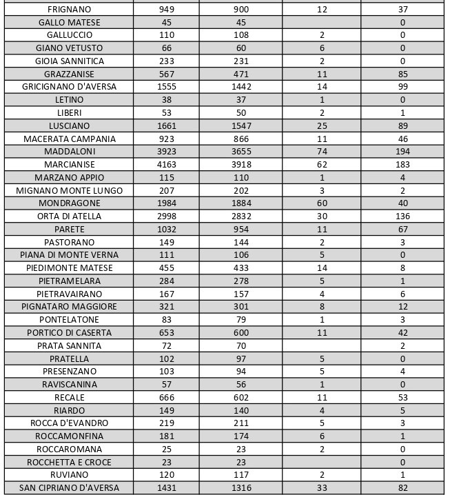 La città più colpita di tutta la provincia risulta essere Aversa con 249 contagiati. Seguono: Caserta con 204 contagiati, Maddaloni 194, Marcianise con 183 contagiati, Santa M. C. Vetere con 182, Orta di Atella 136, Trentola Ducenta 107, San Marcellino con 105, Gricignano con 99. A seguire l’elenco riportato.