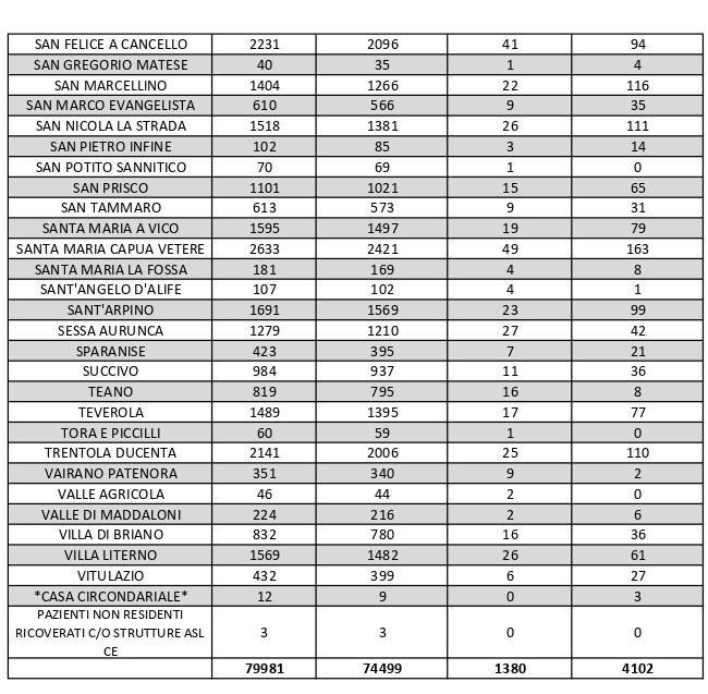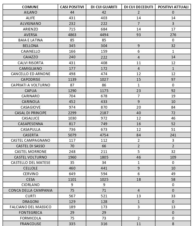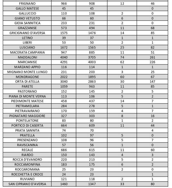 La città più colpita di tutta la provincia risulta essere Aversa con 276 contagiati. Seguono: Maddaloni con 261, Caserta con 241 contagiati, Marcianise con 226 contagiati, Santa M. C. Vetere con 163, Orta di Atella 147, San Marcellino con 116, San Nicola La Strada con 111, Trentola Ducenta con 110, Castel Volturno con 109, Sant’Arpino con 99. A seguire l’elenco riportato.