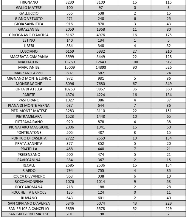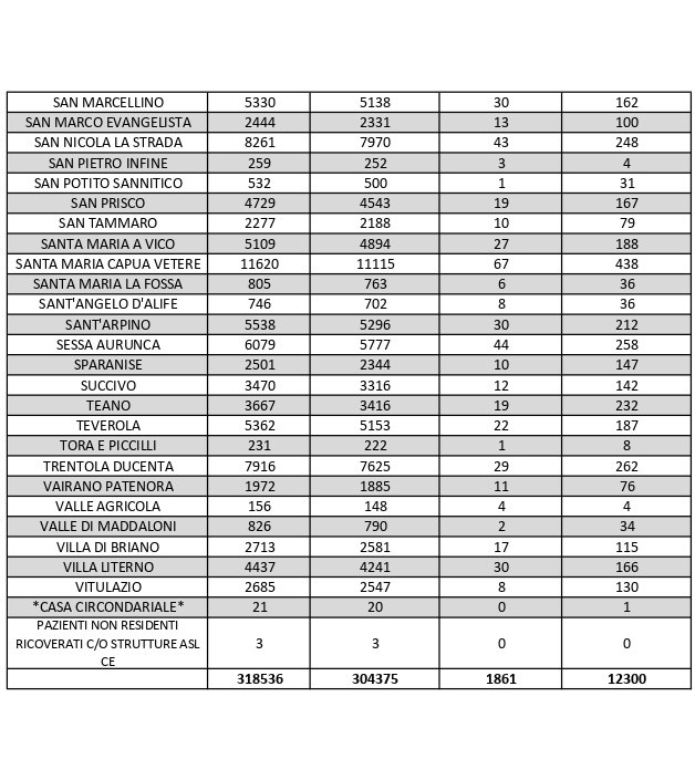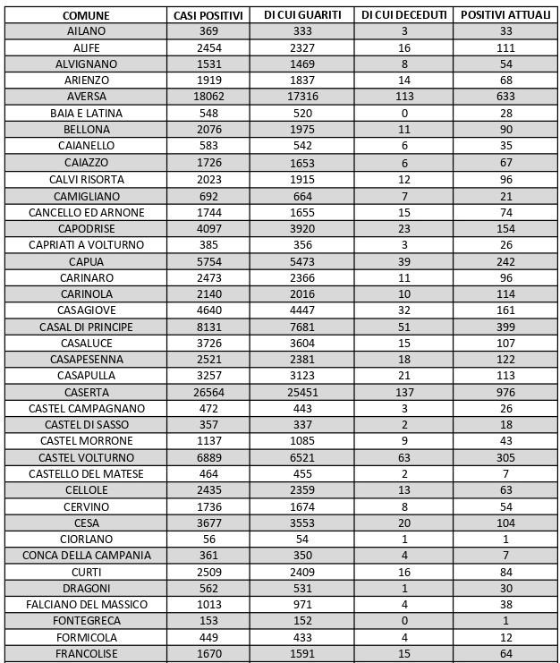 La città più colpita di tutta la provincia risulta essere Caserta con 976 casi positivi, Aversa con 633 Marcianise con 526, Maddaloni con 517, Santa M. C. Vetere con 438, Casal di Principe con 399, Orta Di Atella con 360, Mondragone 349.