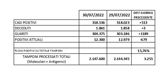 Report Covid-19 – Aggiornato al 31/luglio/2022