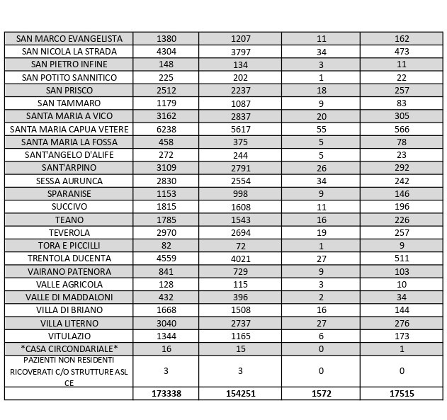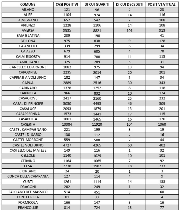 La città più colpita di tutta la provincia risulta essere Caserta con 1.360 casi positivi al Covid, Aversa con 913, Marcianise con864, Maddaloni con 799, Orta di Atella con 591, Santa M. C. Vetere con 566, Casal di Principe con 509. Segue elenco dei dati del bollettino sanitario città per città: