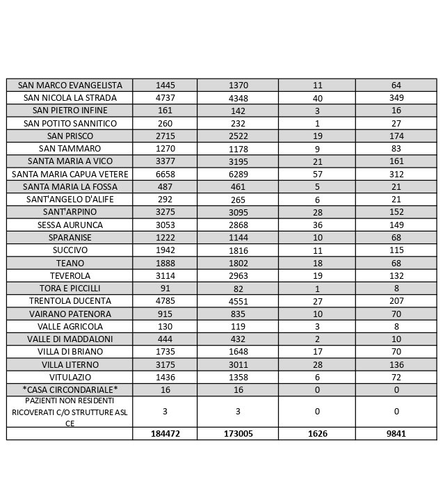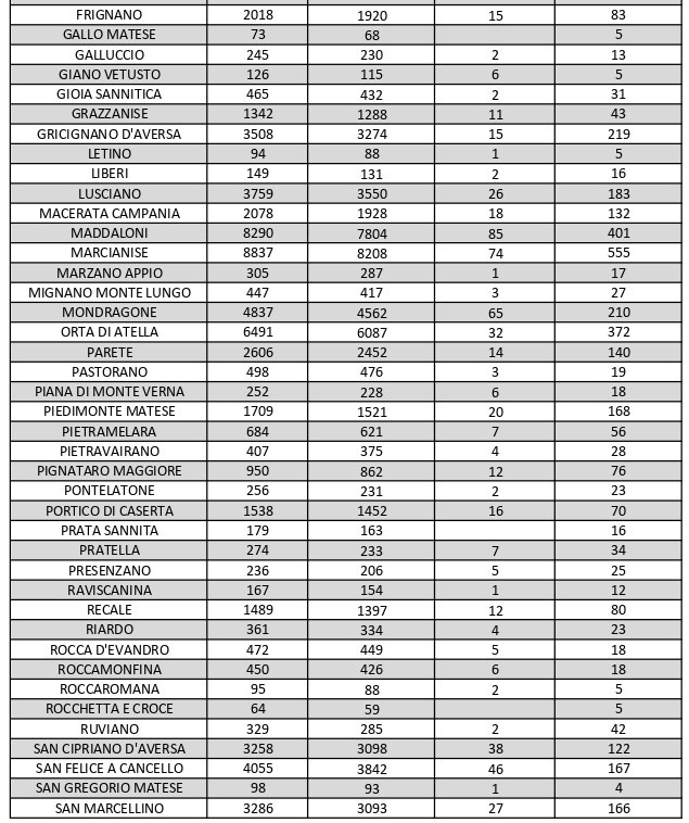 La città più colpita di tutta la provincia risulta essere Caserta con 885 casi positivi al Covid, Aversa con 497, Marcianise con555, Maddaloni con 401, Orta di Atella con 372, Santa M. C. Vetere con 312, Casal di Principe con 219. Segue elenco dei dati del bollettino sanitario città per città: