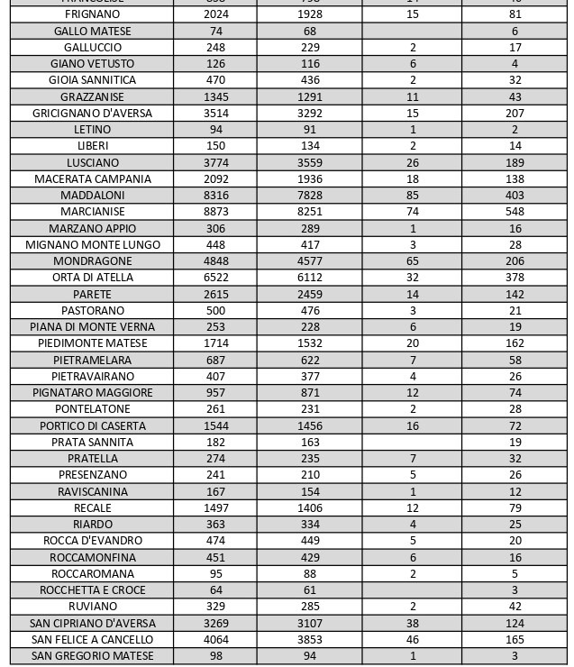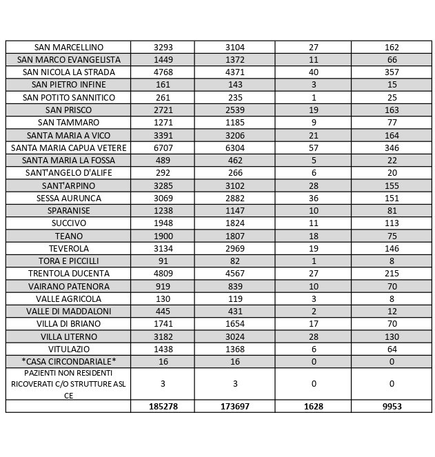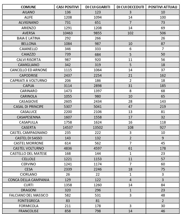 La città più colpita di tutta la provincia risulta essere Caserta con 927 casi positivi al Covid, Aversa con 506, Marcianise con 548, Maddaloni con 403, Orta di Atella con 378, San Nicola la Strada 357, Santa Maria Capua Vetere 346, Casal di Principe con 219. Segue elenco dei dati del bollettino sanitario città per città: