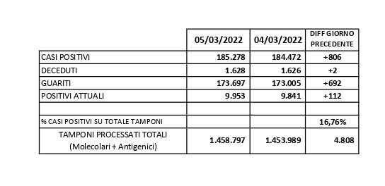 Il tasso di positività riferito ai 4.808 tamponi processati, è pari al 16,71%