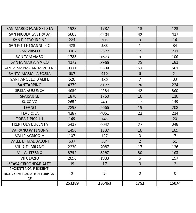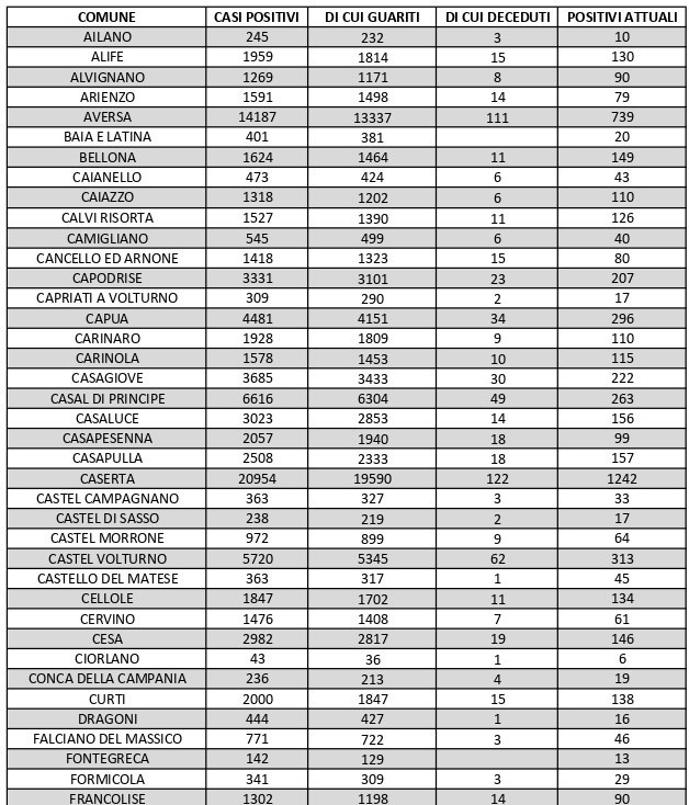 La città più colpita di tutta la provincia risulta essere Caserta con 1.242 casi positivi al Covid, Marcianise con 766, Aversa con 739, Maddaloni con 625, Santa M. C. Vetere con 561, Orta di Atella con 492, San Nicola La Strada con 417, Sessa Aurunca 360, Mondragone 341, Trentola Ducenta 348, Lusciano con 302.
