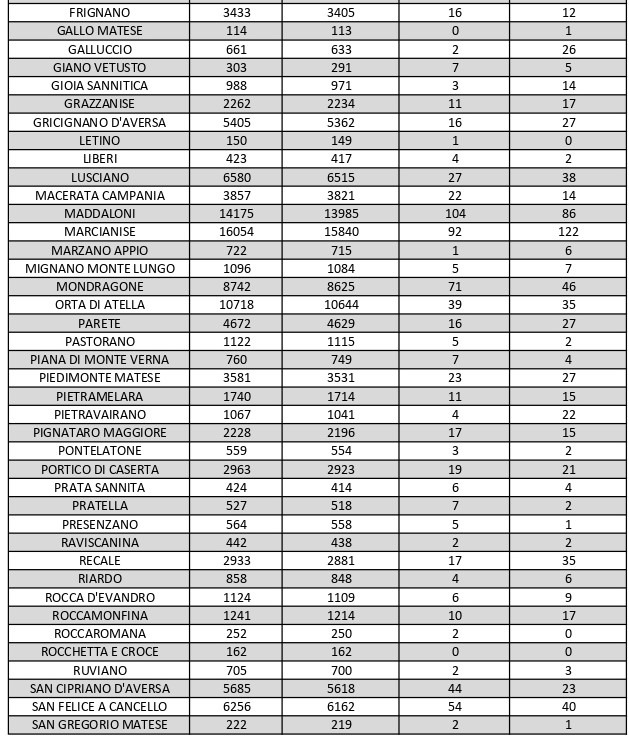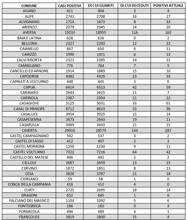 La città più colpita di tutta la provincia risulta essere Caserta con 287 casi positivi, Aversa con 162, Marcianise con 122, Santa M. C. Vetere con 93, Maddaloni 86, San Nicola La Strada con 70. Segue elenco dei dati del bollettino sanitario città per città: