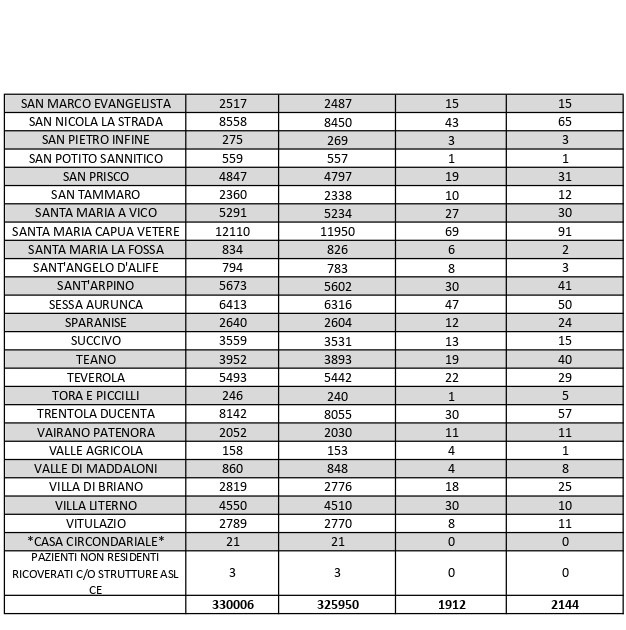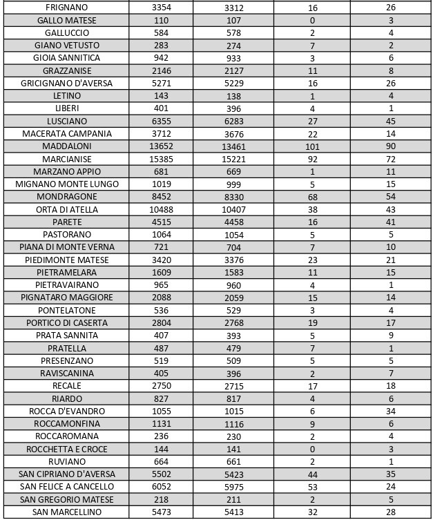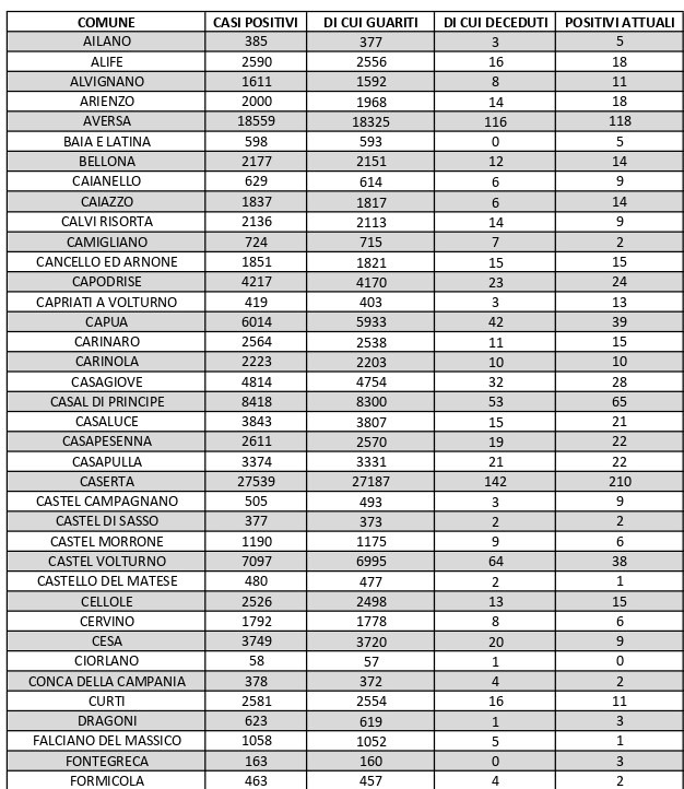 La città più colpita di tutta la provincia risulta essere Caserta con 210 casi positivi, Aversa con 118, Santa M. C. Vetere con 91, Maddaloni con 90, Marcianise con 91, Mondragone 54.