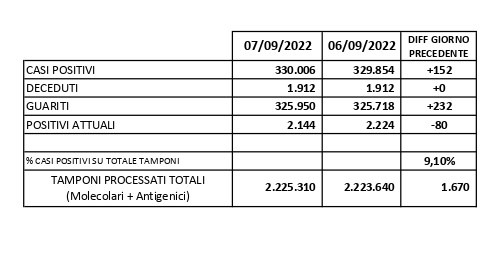 Report Covid-19 – Aggiornato al 08/settembre/2022