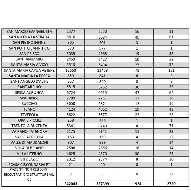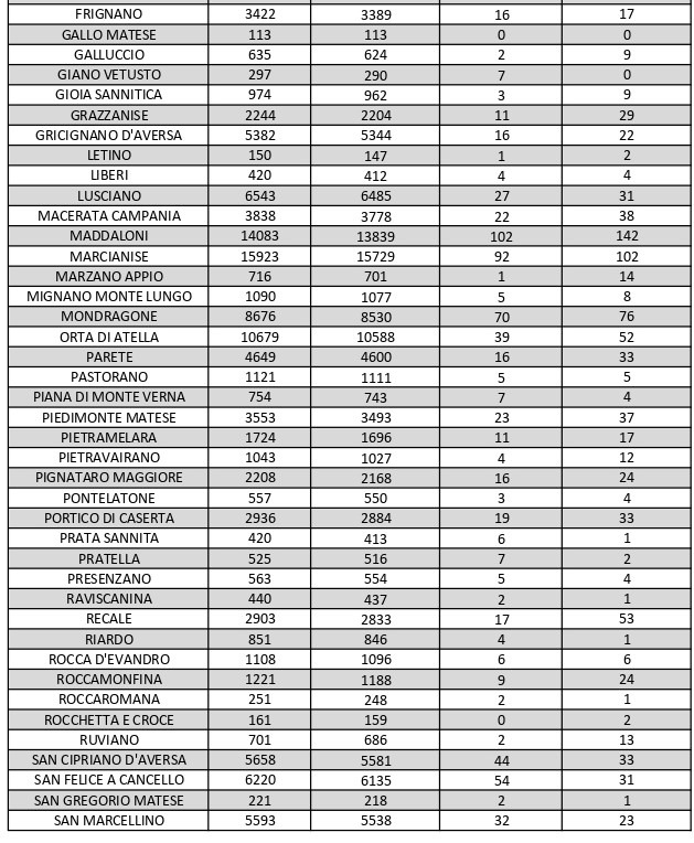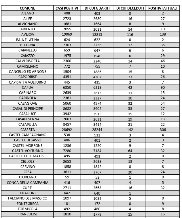 La città più colpita di tutta la provincia risulta essere Caserta con 306 casi positivi, Maddaloni 142, Aversa con 138, Santa M. C. Vetere con 121, Marcianise con 102, Capua 90, San Nicola La Strada con 81, Sessa Aurunca 62. Segue elenco dei dati del bollettino sanitario città per città: