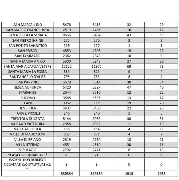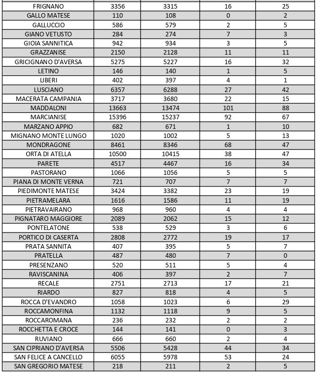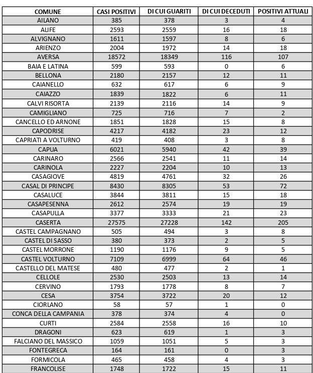 La città più colpita di tutta la provincia risulta essere Caserta con 205 casi positivi, Aversa con 107, Maddaloni con 88, Santa M. C. Vetere con 67, Marcianise con 78, Mondragone 47.