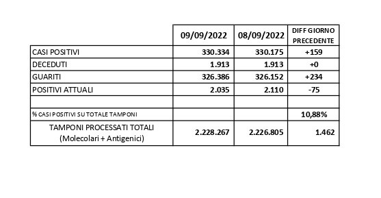 Report Covid-19 – Aggiornato al 10/settembre/2022