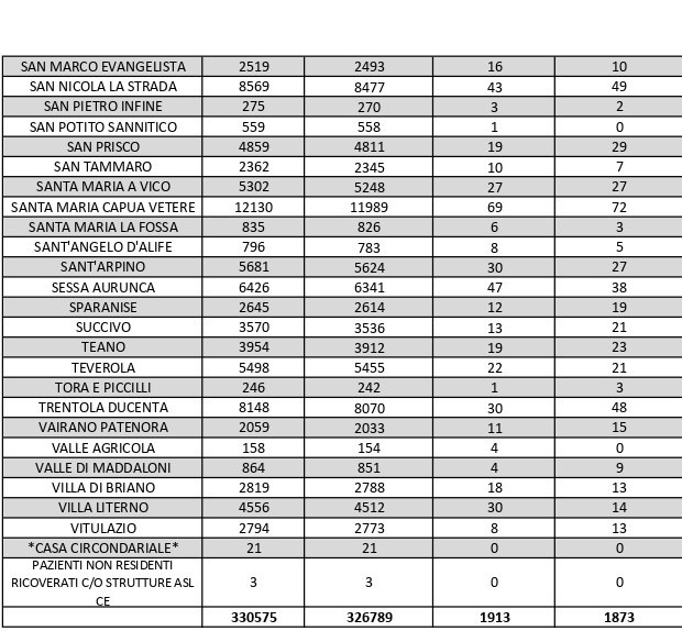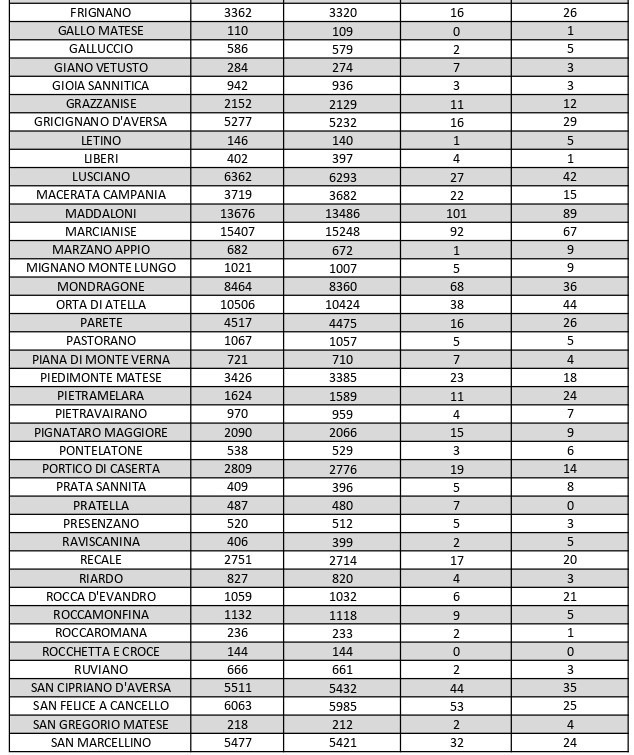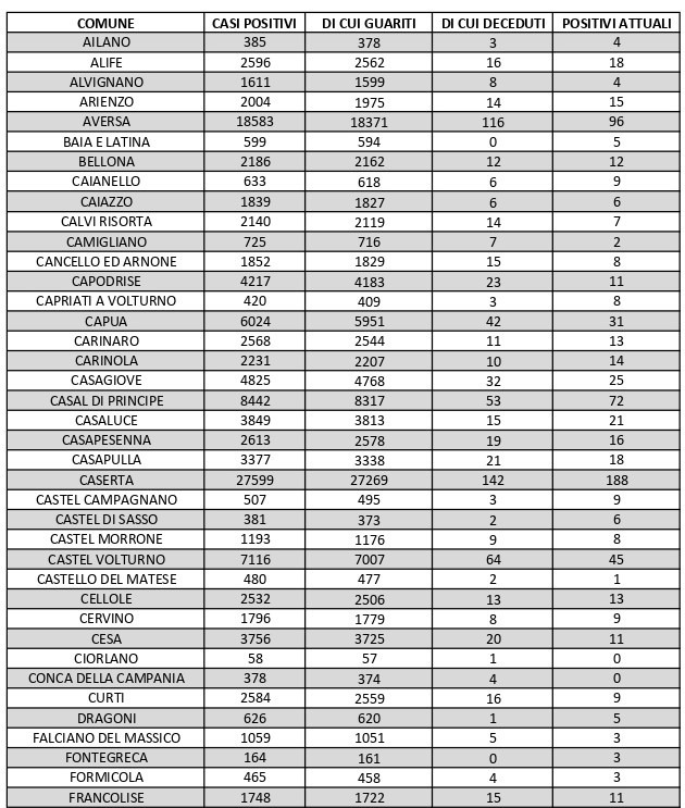 La città più colpita di tutta la provincia risulta essere Caserta con 188 casi positivi, Aversa con 96, Maddaloni con 89, Santa M. C. Vetere con 72, Marcianise con 67.
