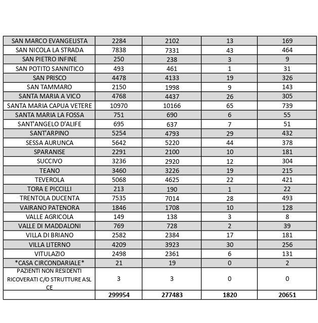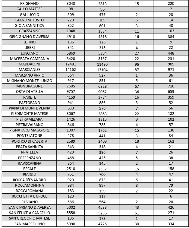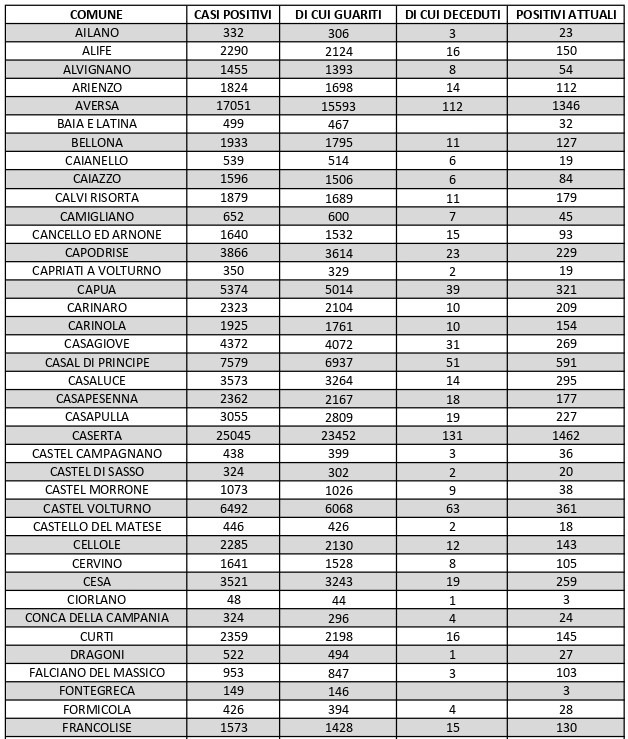 La città più colpita di tutta la provincia risulta essere Caserta con 1.462 casi positivi, Aversa con 1.346 Marcianise con 971, Maddaloni con 905, Santa M. C. Vetere con 739, Orta Di Atella con 659, Mondragone 710, Trentola Ducenta con 493, San Nicola La Strada con 464 casi.