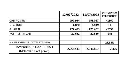 Report Covid-19 – Aggiornato al 13/luglio/2022