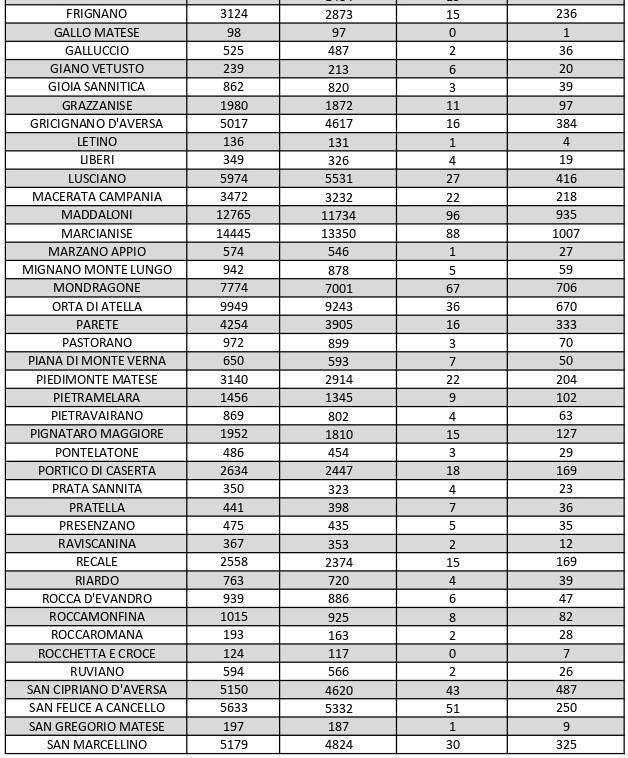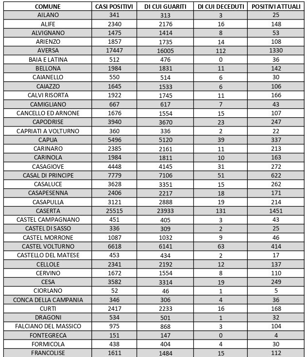 La città più colpita di tutta la provincia risulta essere Caserta con 1.451 casi positivi, Aversa con 1.330 Marcianise con 1.077, Maddaloni con 935, Santa M. C. Vetere con 690, Mondragone 706, Orta Di Atella con 670, Trentola Ducenta con 494, San Cipriano D’Aversa con 487, San Nicola La Strada con 486 casi.