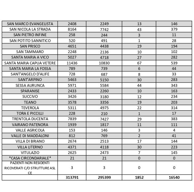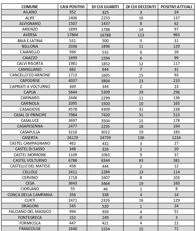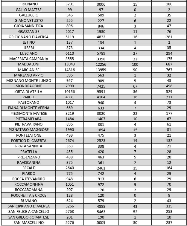 La città più colpita di tutta la provincia risulta essere Caserta con 1.234 casi positivi, Aversa con 963, Marcianise con 767, Maddaloni con 687, Santa M. C. Vetere con 539, Orta Di Atella con 529, Casal di Principe con 524, Mondragone 498, San Nicola La Strada con 379 casi, Trentola Ducenta con 383, San Cipriano D’Aversa con 335.