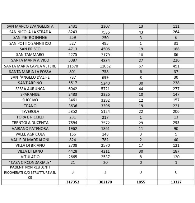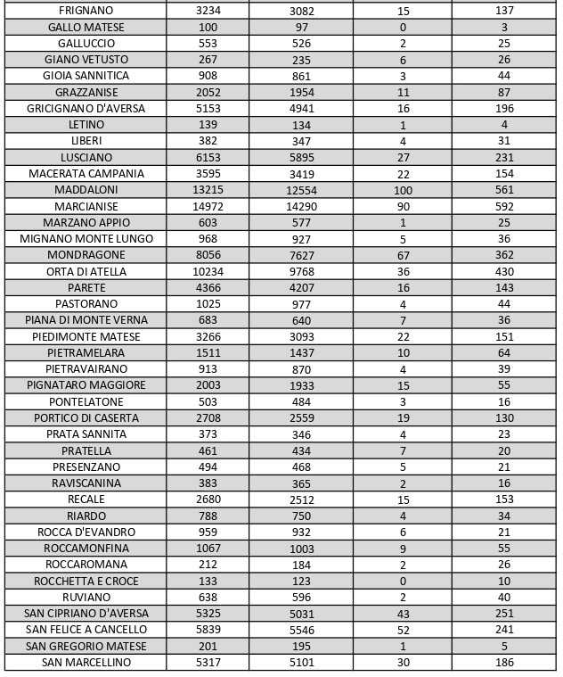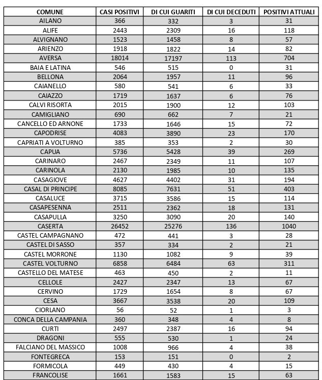 La città più colpita di tutta la provincia risulta essere Caserta con 1.040 casi positivi, Aversa con 704 Marcianise con 592, Maddaloni con 561, Santa M. C. Vetere con 451, Orta Di Atella con 430, Casal di Principe con 403, Mondragone 362.