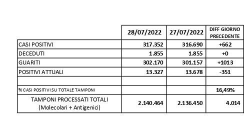 Report Covid-19 – Aggiornato al 29/luglio/2022