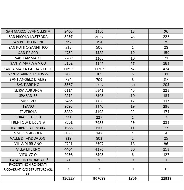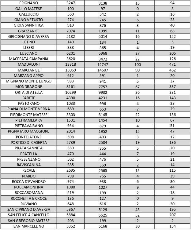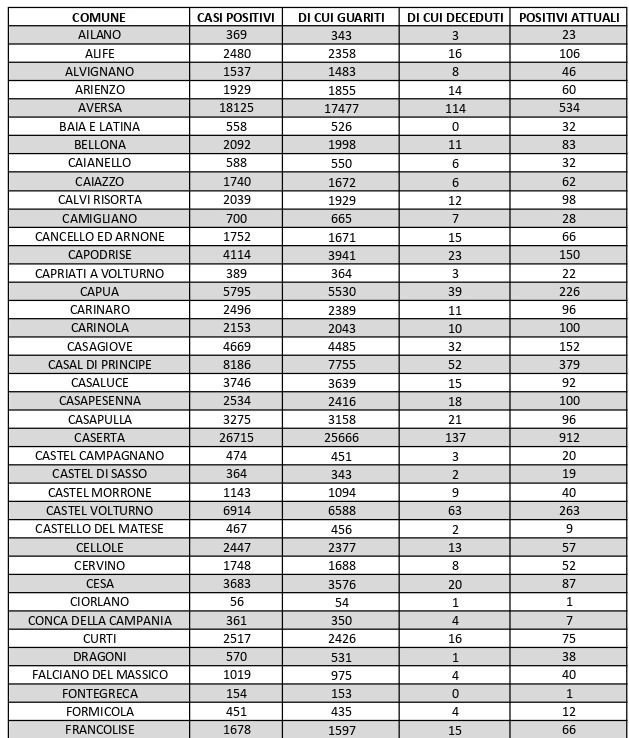 La città più colpita di tutta la provincia risulta essere Caserta con 912 casi positivi, Aversa con 534 Maddaloni con 471, Marcianise con 462, Santa M. C. Vetere con 424, Casal di Principe con 379, Mondragone 337, Orta Di Atella con 331.