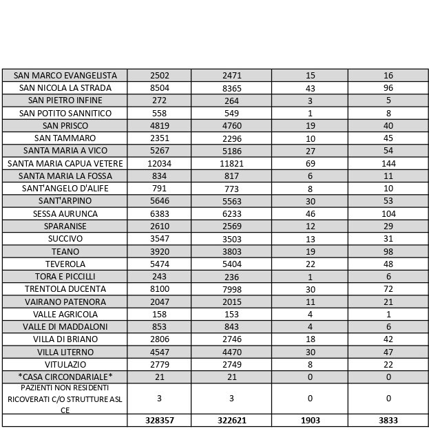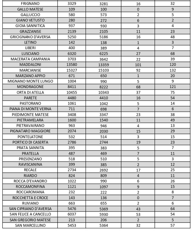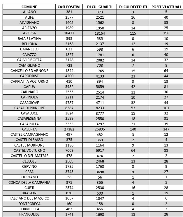 La città più colpita di tutta la provincia risulta essere Caserta con 347 casi positivi, Aversa con 198, Santa M. C. Vetere con 144, Marcianise con 132, Mondragone 121, Maddaloni con 120, Casal di Principe con 101, Orta Di Atella con 75.