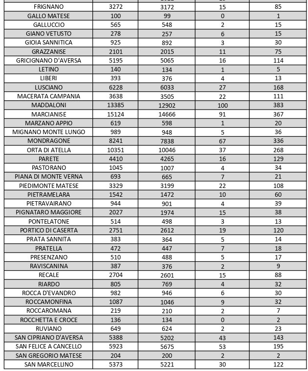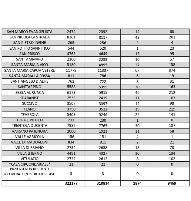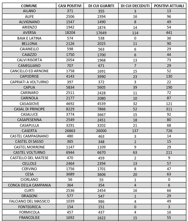 La città più colpita di tutta la provincia risulta essere Caserta con 726 casi positivi, Aversa con 441, Maddaloni con 383, Santa M. C. Vetere con 374, Marcianise con 367, Mondragone 336, Casal di Principe con 311, Orta Di Atella con 268.