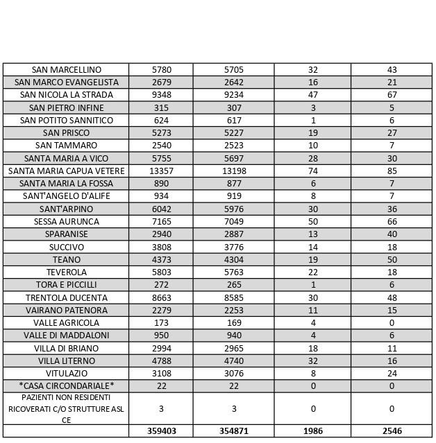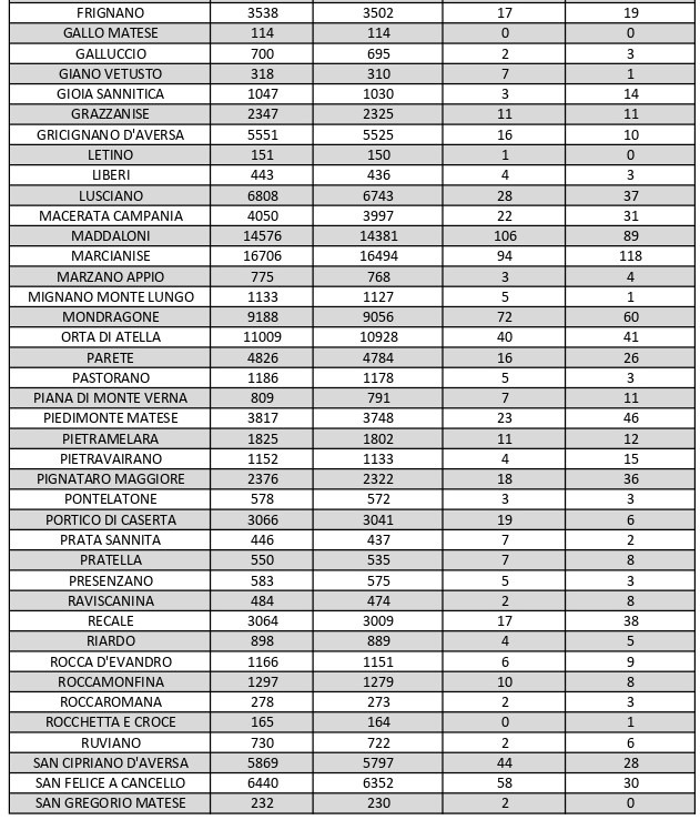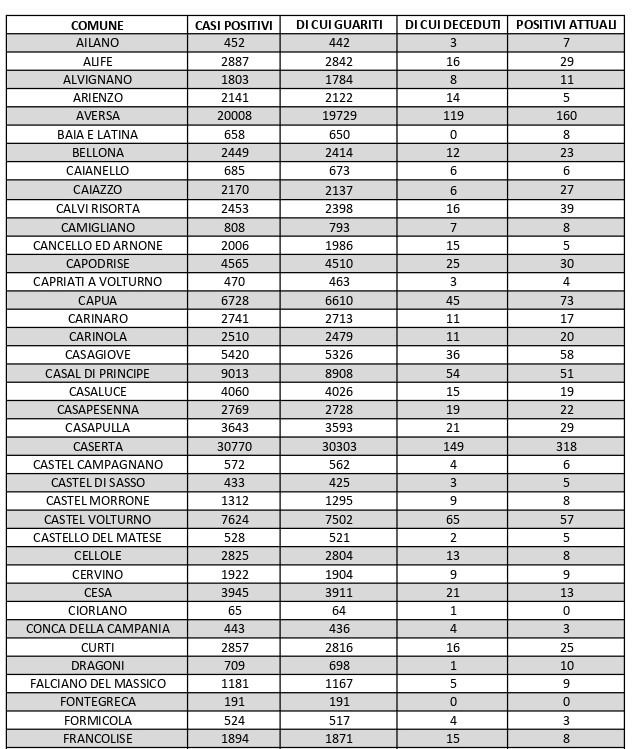 La città più colpita di tutta la provincia risulta essere Caserta con 318 casi positivi, Aversa con 160, Marcianise con 118, Maddaloni con 89, Santa M. C. Vetere con 85, Capua con 73, San Nicola La Strada con 67, Mondragone con 60. Segue elenco dei dati del bollettino sanitario città per città: