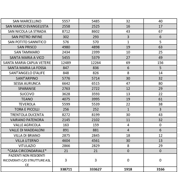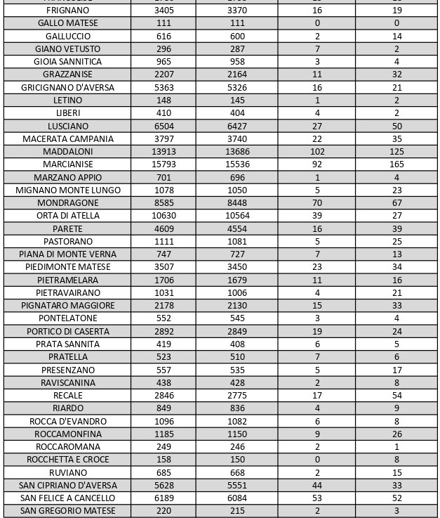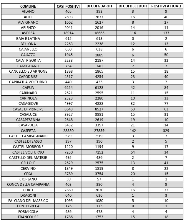 La città più colpita di tutta la provincia risulta essere Caserta con 329 casi positivi, Marcianise con 165, Santa M. C. Vetere con 156, Aversa con 133, Maddaloni 125, Capua con 84, Sessa Aurunca 80.Segue elenco dei dati del bollettino sanitario città per città:
