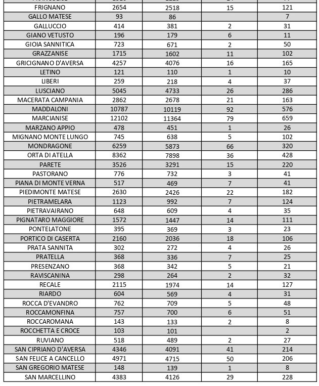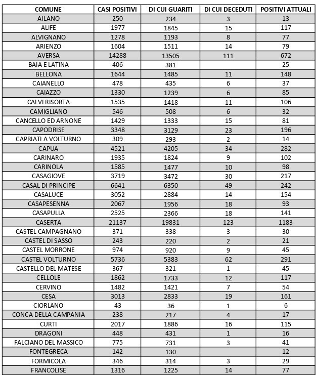 La città più colpita di tutta la provincia risulta essere Caserta con 1.183 casi positivi, Aversa con 672, Marcianise con 659, Maddaloni con 576, Santa M. C. Vetere con 507, Orta di Atella con 428, San Nicola La Strada con 386, Trentola Ducenta 337, Mondragone 320, Sessa Aurunca 307, Lusciano con 286.