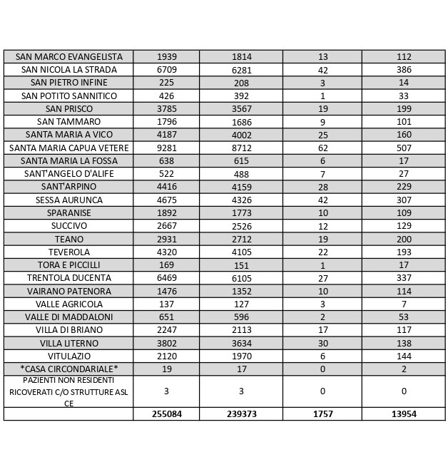 Il bollettino quotidiano diffuso oggi dall’Asl di Caserta sull’andamento dell’epidemia di Covid-19 in tutta la provincia evidenzia 323 nuovi casi positivi al virus su un totale di 1.661 tamponi giornalieri processati dalle strutture distrettuali sanitarie.