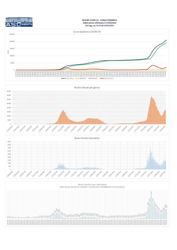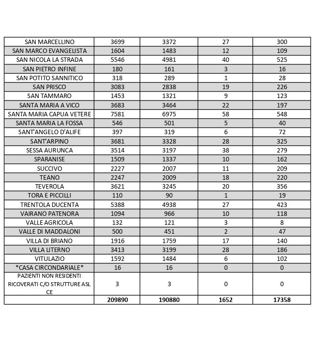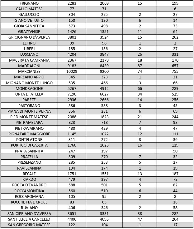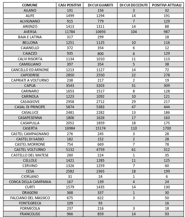 La città più colpita di tutta la provincia risulta essere Caserta con 1.700 casi positivi al Covid, Marcianise con 755, Aversa con 9878, Maddaloni con 657, Santa M. C. Vetere con 548, San Nicola La Strada con 525, Orta di Atella con 529, Casal di Principe con 444.