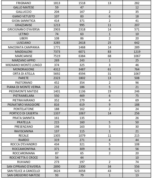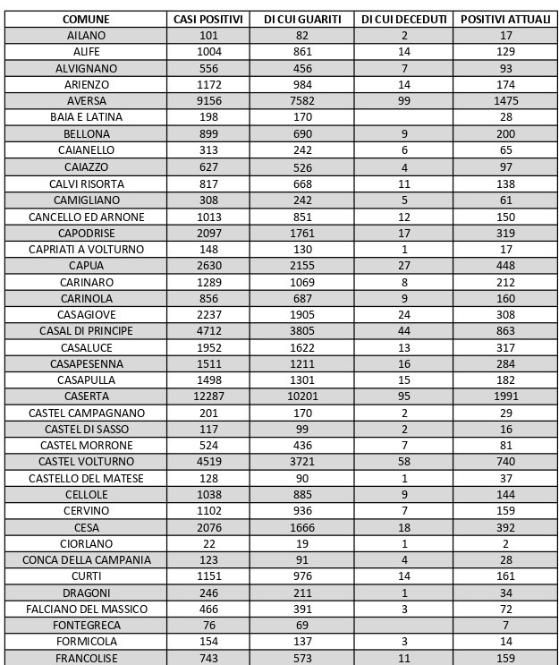 La città più colpita di tutta la provincia risulta essere Caserta con 1.991 casi positivi al Covid, Aversa con 1.475, Maddaloni con 1.219, Orta di Atella con 1.067, Marcianise con1.067, Casal di Principe con 863, Mondragone con 764, Santa M. C. Vetere con 861. Segue elenco dei dati del bollettino sanitario città per città: