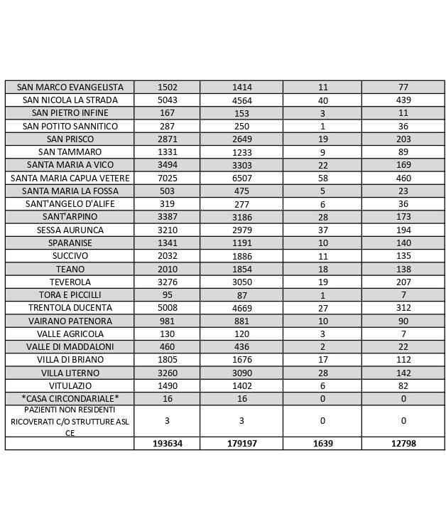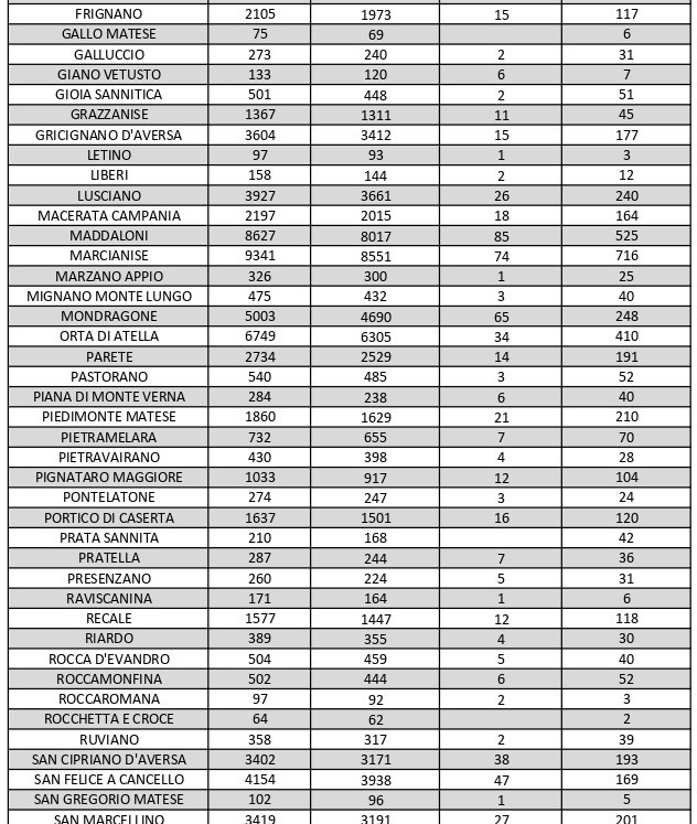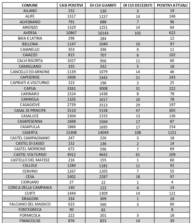 La città più colpita di tutta la provincia risulta essere Caserta con 1.151 casi positivi al Covid, Marcianise con 716, Aversa con 622, Maddaloni con 525, Santa Maria Capua Vetere 460, San Nicola la Strada 439, Orta di Atella con 410, Casal di Principe con 305. Segue elenco dei dati del bollettino sanitario città per città: