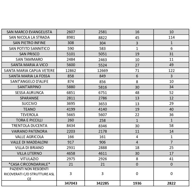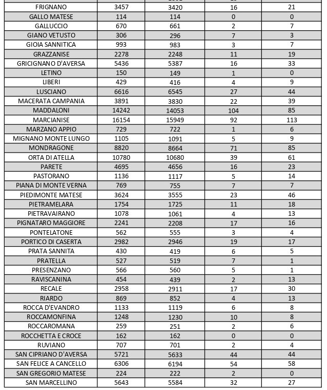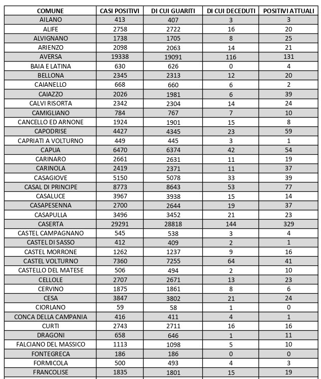 La città più colpita di tutta la provincia risulta essere Caserta con 329casi positivi, Aversa con 131, Santa M. C. Vetere con 122, San Nicola La Strada con 114, Marcianise con 113, Maddaloni 85, Mondragone con 85, Casal di Principe con77. Segue elenco dei dati del bollettino sanitario città per città: