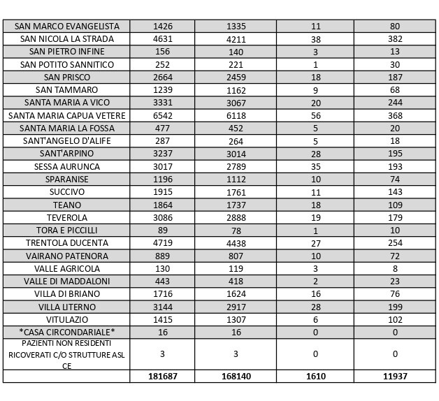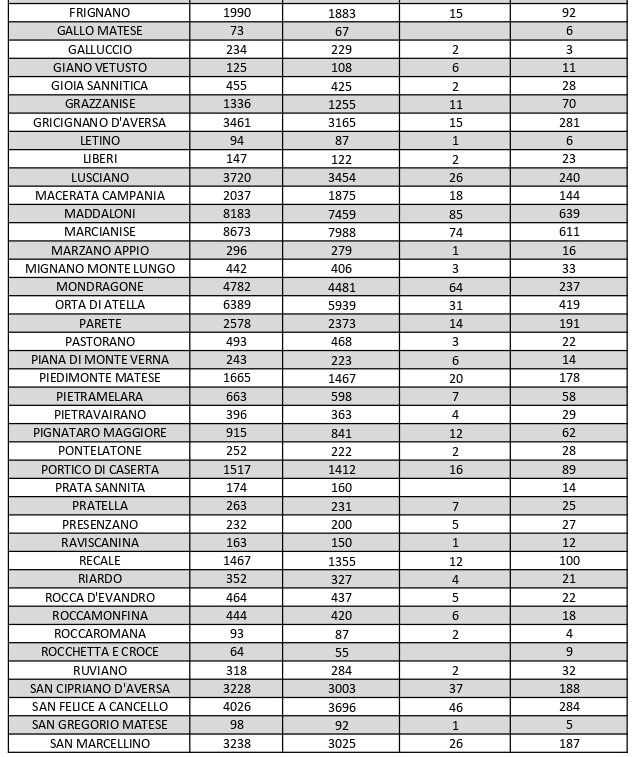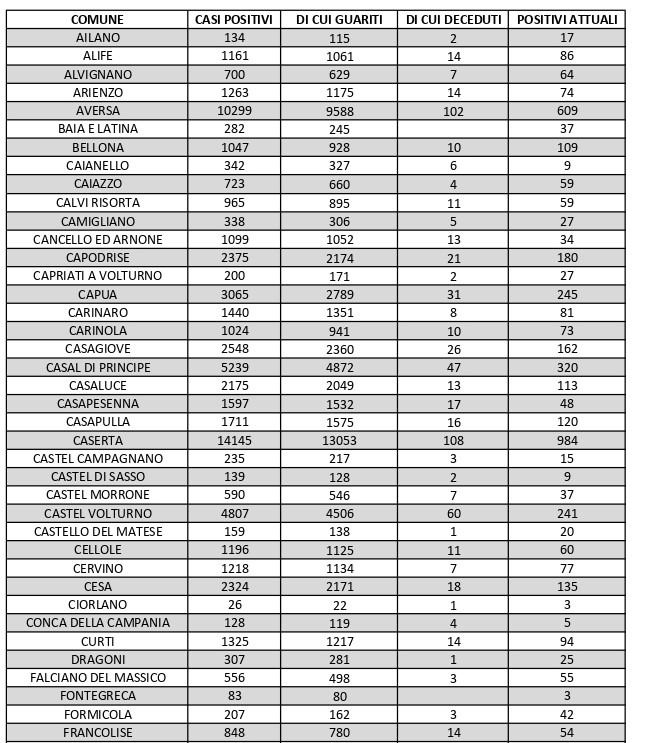 La città più colpita di tutta la provincia risulta essere Caserta con 984 casi positivi al Covid, Aversa con 609, Maddaloni con 639, Marcianise con 611, Orta di Atella con 419, San Nicola la Strada 382, Casal di Principe con 320, Santa M. C. Vetere con 368. Segue elenco dei dati del bollettino sanitario città per città: