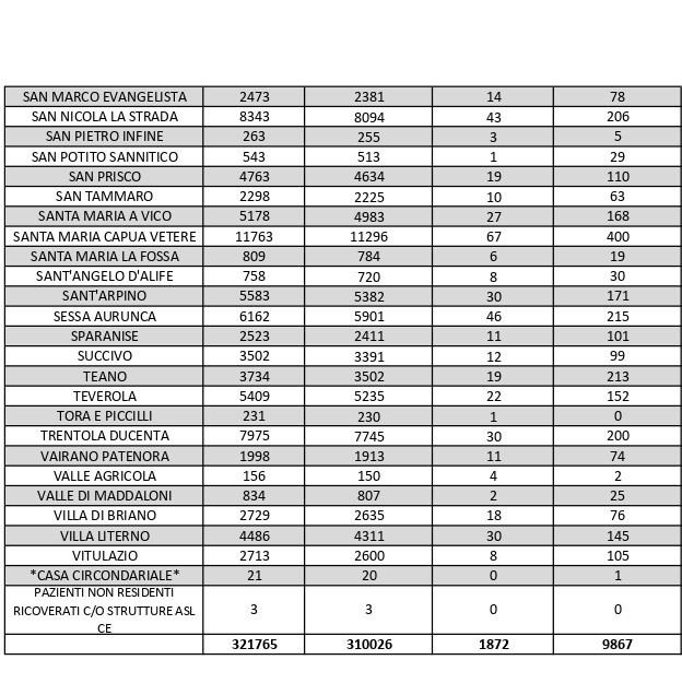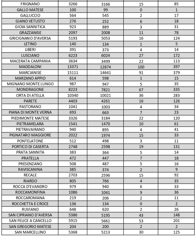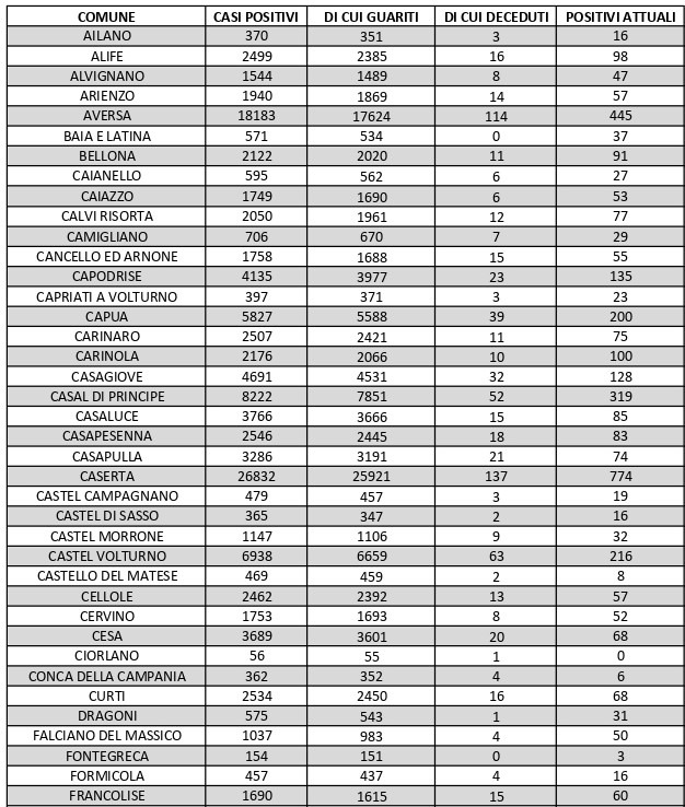 La città più colpita di tutta la provincia risulta essere Caserta con 774 casi positivi, Aversa con 445, Santa M. C. Vetere con 400, Maddaloni con 397, Marcianise con 379, Mondragone 335, Casal di Principe con 319, Orta Di Atella con 283.