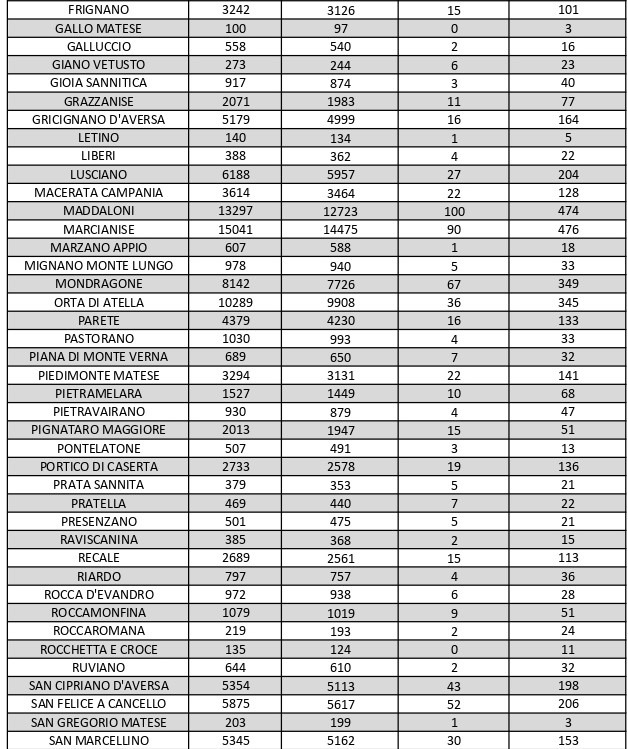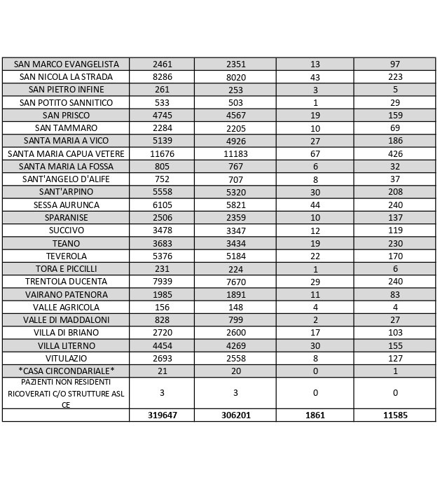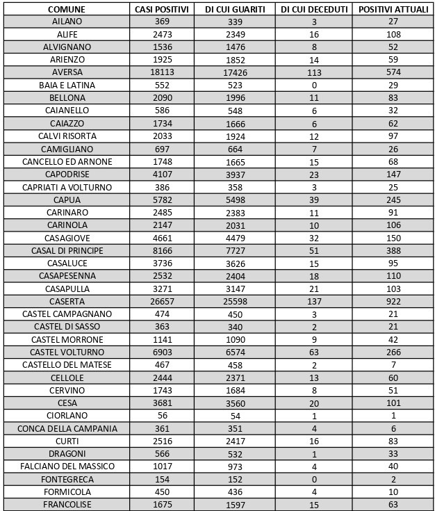 La città più colpita di tutta la provincia risulta essere Caserta con 922 casi positivi, Aversa con 574 Marcianise con 476, Maddaloni con 474, Santa M. C. Vetere con 426, Casal di Principe con 388, Mondragone 349, Orta Di Atella con 345.