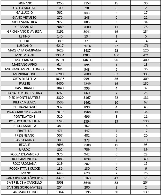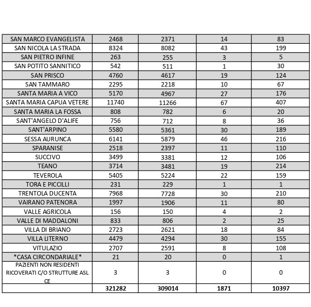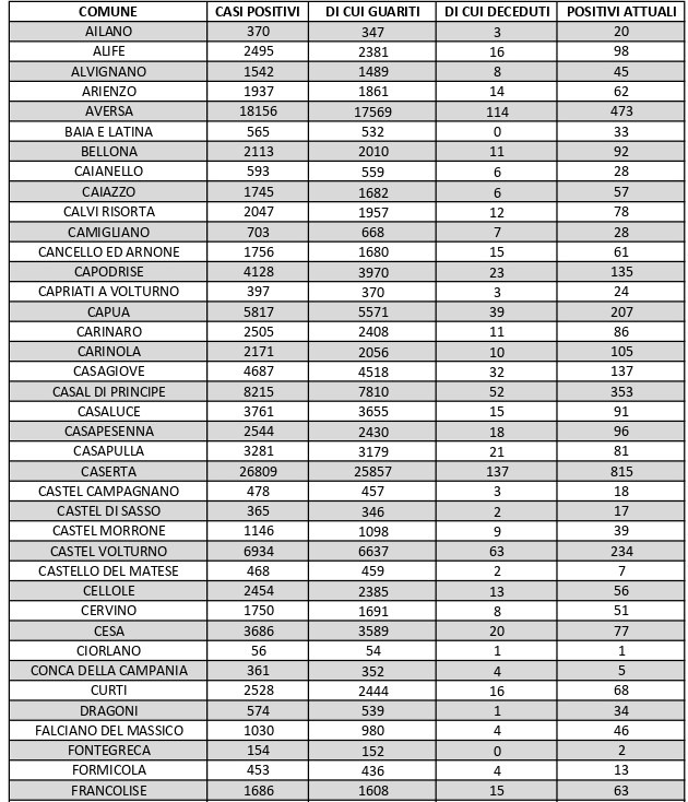 La città più colpita di tutta la provincia risulta essere Caserta con 815 casi positivi, Aversa con 473 Maddaloni con 421, Marcianise con 400, Santa M. C. Vetere con 407, Casal di Principe con 353, Mondragone 333, Orta Di Atella con 309.