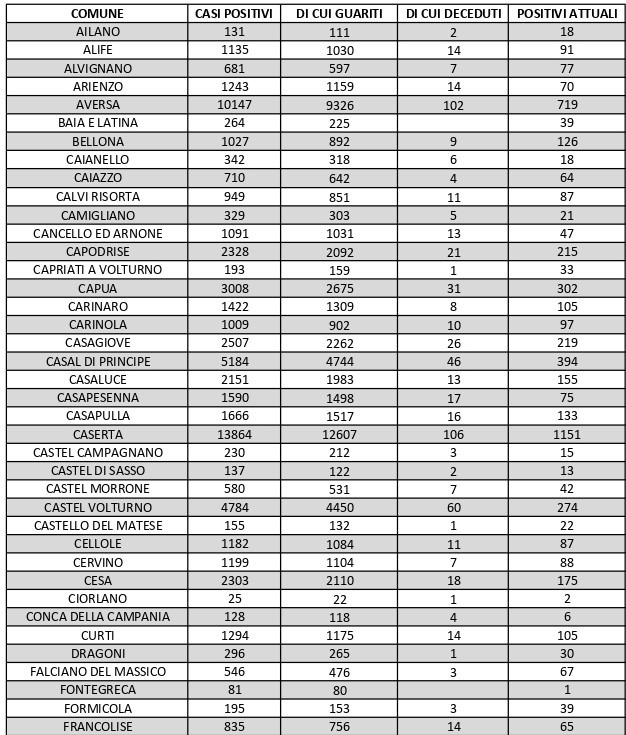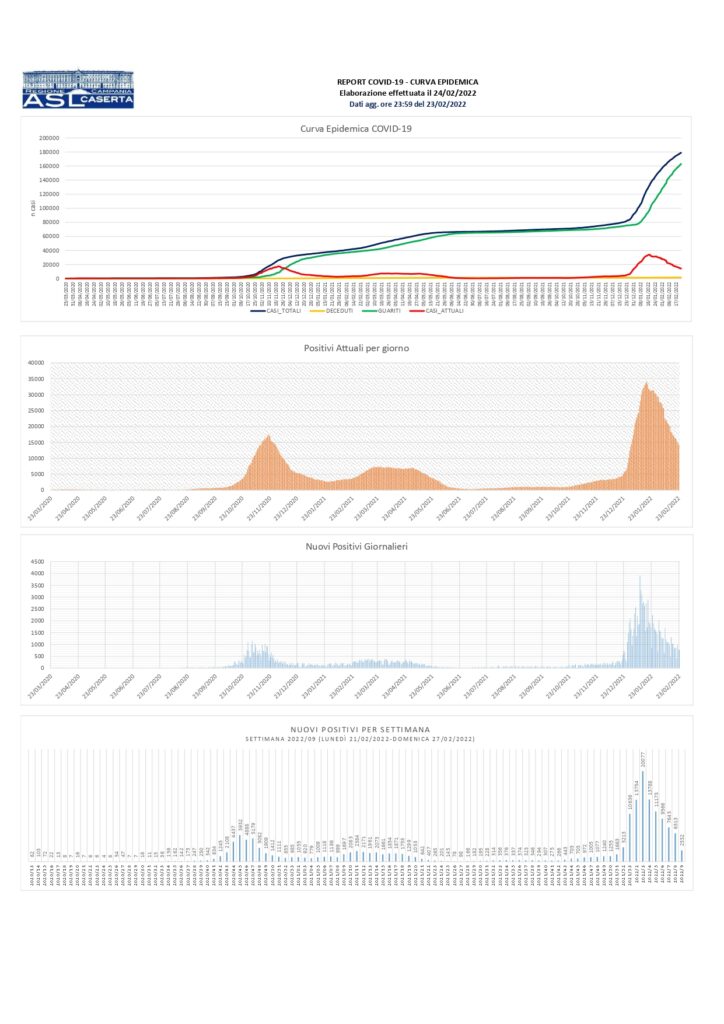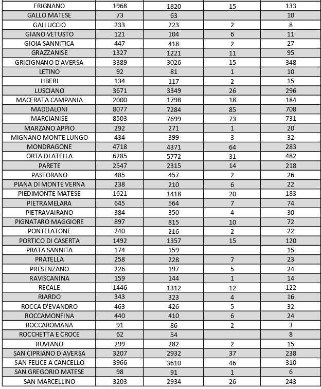 La città più colpita di tutta la provincia risulta essere Caserta con 1.151 casi positivi al Covid, Aversa con 719, Marcianise con731, Maddaloni con 708, Orta di Atella con 482, Santa M. C. Vetere con 486, Trentola 357, Casal di Principe con 394. Segue elenco dei dati del bollettino sanitario città per città del 24 febbraio 2022: