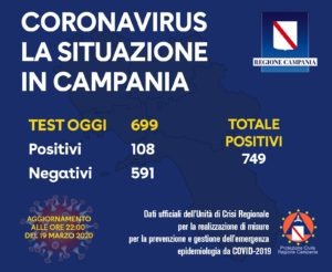 Totale positivi di oggi 108 su 699 (compresi i precedenti della mattinata). Il totale dei contagiati in Campania sale a 749. In vista del picco di Covid-19, intanto, l’ospedale di Agropoli tornerà in funzione e diventerà il punto di riferimento per il Covid-19 del basso Cilento. La decisione è stata presa nella serata di ieri in Regione Campania, dopo le pressanti richieste dei sindaci del comprensorio e i numerosi messaggi di molti cilentani sulla pagina Facebook del presidente Vincenzo De Luca.
