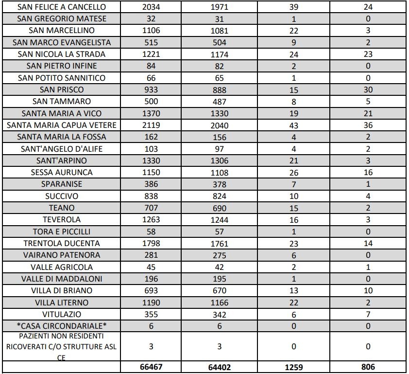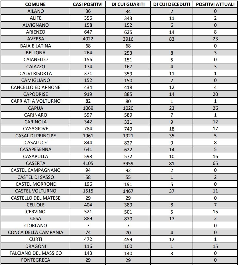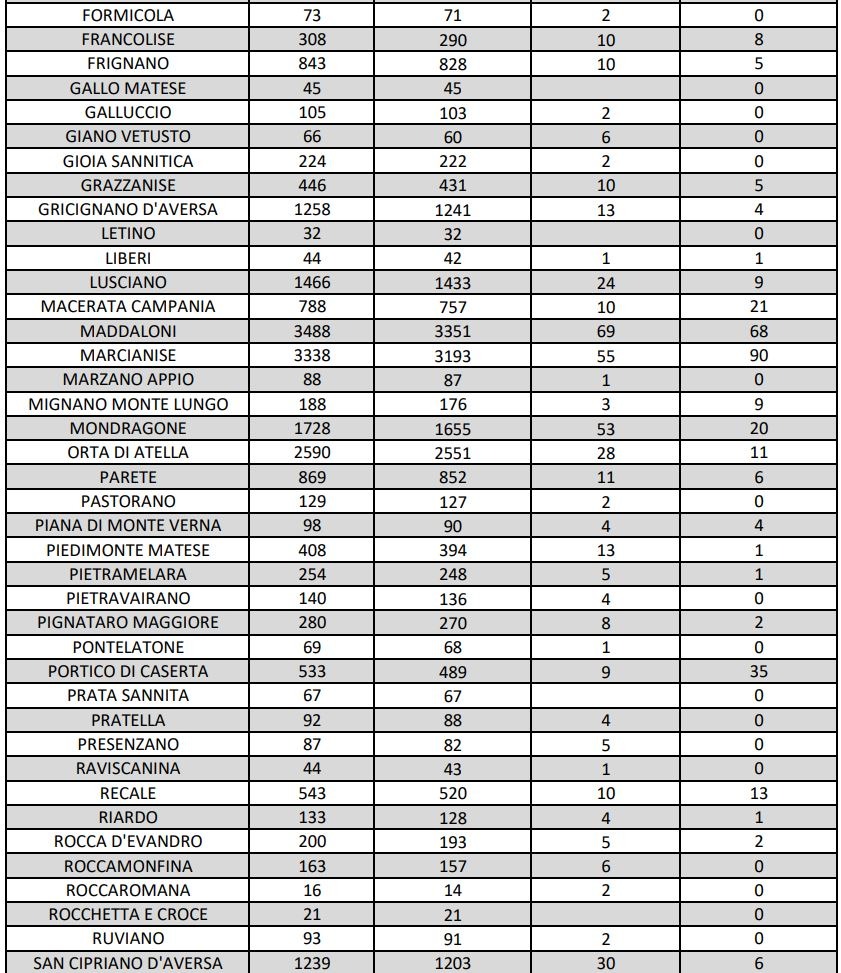 Nel bollettino odierno Caserta conta attualmente 65 positivi sebbene la città maggiormente colpita in tutta la provincia sia Marcianise con 90 contagiati seguite a ruota da Maddaloni con 68; seguono Santa Maria Capua Vetere con 36 positivi, Capua con 26 e San Nicola La Strada con 23. Ad Aversa si contano attualmente 23 positivi, dati che vanno letti tenendo conto anche dei casi nei Comuni dell’intero Agro aversano, area densamente popolata con i centri abitati che sono confinanti tra di loro. Questi i dati riferiti alle singole realtà territoriali: le persone attualmente positive sono una a Carinaro, 8 a Casaluce, 2 a Cesa, a Gricignano d’Aversa sono 4, a Lusciano 9, a Parete 6 e a Teverola 3. Negli altri centri la situazione è la seguente: Casal di Principe conta 5 contagi, Casapesenna 5, Frignano 5, San Cipriano d’Aversa 6, San Marcellino 3, Sant’Arpino 3, Trentola Ducenta 14, Succivo 4, Villa di Briano 10, Villa Literno 2 e Orta di Atella 11.