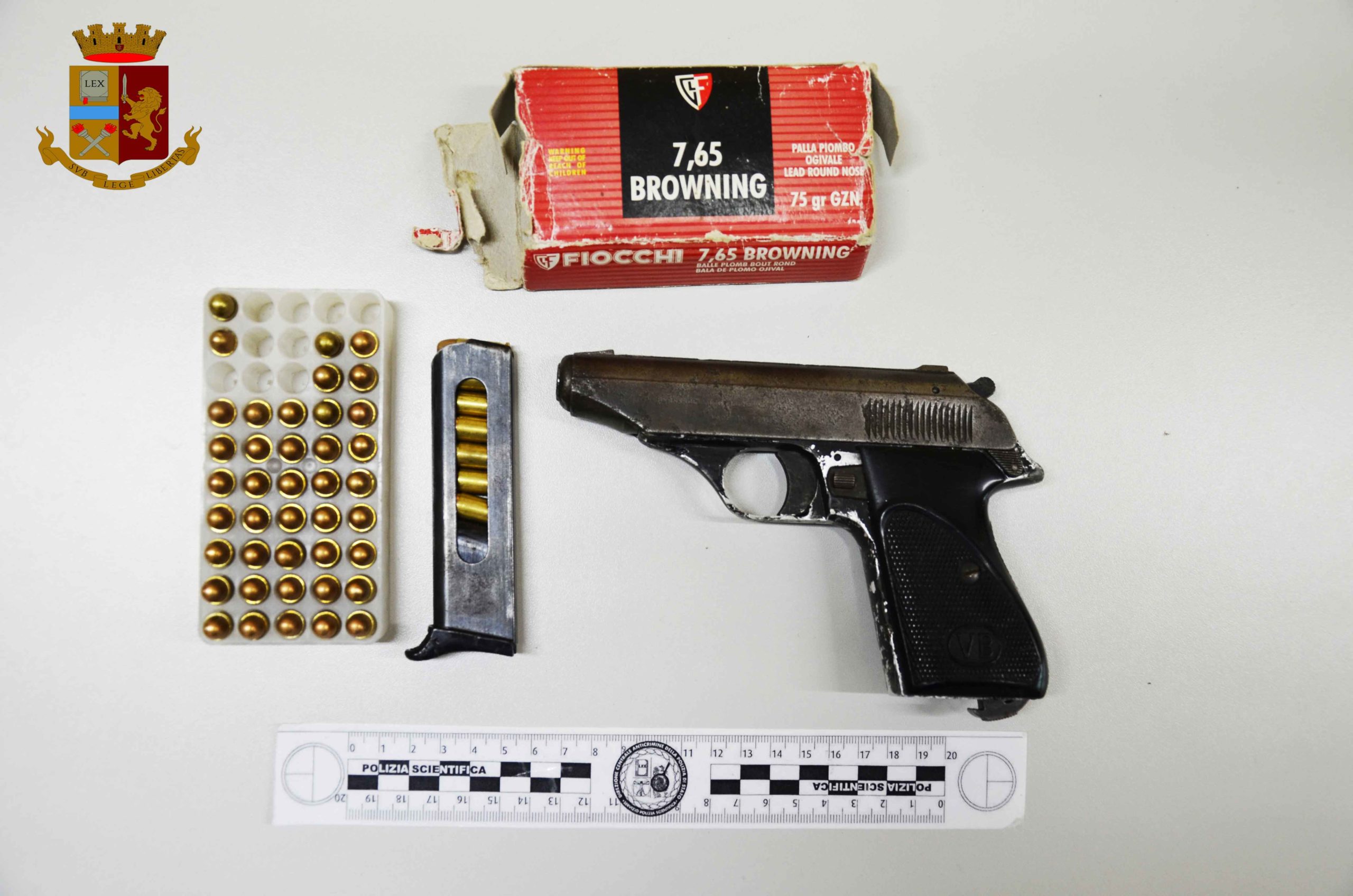 Nel corso dell’attività di ricerca sono stati rinvenuti, celati in uno zaino a sacco di colore mimetico, una pistola marca Bernardelli calibro 7,65 con matricola abrasa, il relativo caricatore appositamente rifornito con 7 cartucce dello stesso calibro, nonché una scatola marca fiocchi, con relativo porta cartucce, contenente circa 40 proiettili calibro 7,65. L’arma era clandestina in quanto non riportante i punzoni identificativi e con matricola abrasa.
