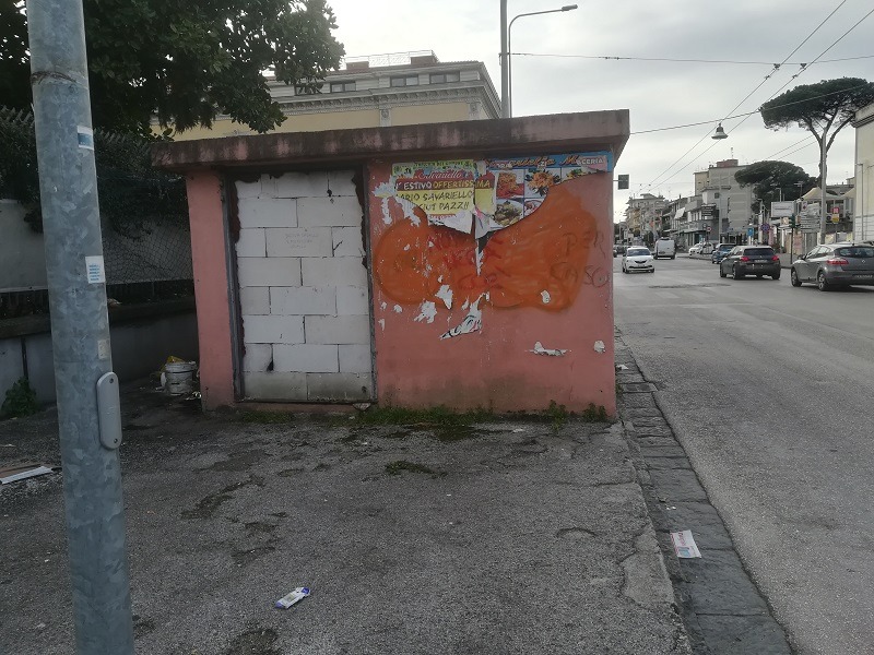 L’assurdo è che il casotto è stato costruito partendo dal bordo del marciapiede. Chi lo ha progettato, invece di lasciare il passaggio pedonale davanti alla struttura, ha pensato bene di costringere le persone ad una gimcana sul retro. Ciò che quello spazio è diventato, è solo una prevedibile conseguenza di questa scelta.
