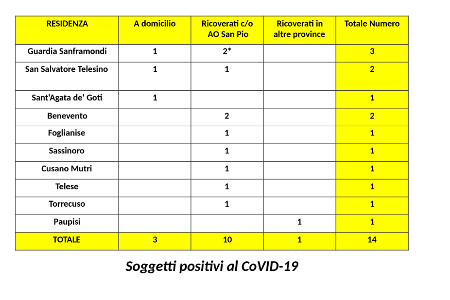 Si attesta attualmente a 1103 il totale complessivo dei positivi al Coronavirus in Campania: si tratta di un numero sicuramente molto alto e ancora in crescita, ma che per ora sembra allontanare lo spettro del temuto picco di contagi, la cui percentuale al momento è ancora stabile. La provincia campana che ad oggi registra meno casi di positività è Benevento, che secondo i dati aggiornati alle ore 12 del 24 marzo, conta sul proprio territorio 14 cittadini infetti. Il Comune che registra più casi di positività è Guardia Sanframondi, paese da poco meno di 5000 abitanti che conta 3 contagi accertati (di cui uno, tuttavia, con domicilio a Telese), dei quali uno in isolamento domiciliare e due ricoverati presso la struttura ospedaliera San Pio di Benevento.