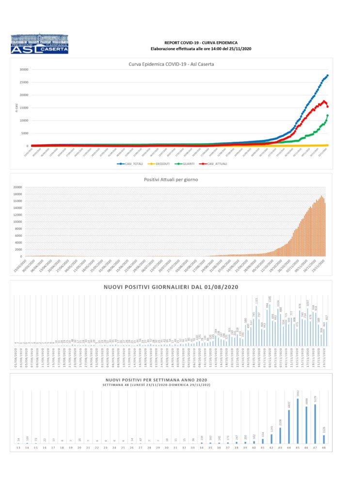 Il bollettino quotidiano diffuso dall’Asl di Caserta e aggiornato alle 14 di oggi evidenzia ben 657 nuovi positivi in provincia nelle ultime ventiquattr’ore, con 9 decessi a causa dell’infezione da Covid-19 e delle sue conseguenze. Il numero complessivo delle morti per Coronavirus in Terra di lavoro dall’inizio della pandemia a oggi sale, dunque, da 251 a 260. I nuovi positivi sono stati ricavati dai 3.699 tamponi effettuati ieri. Vi sono state, per fortuna, anche 1.991 guarigioni e questo sembra essere il dato più positivo. Tra le città con il numero più alto di persone attualmente positive: Caserta (1.110); Aversa (1.101); Marcianise (800); Maddaloni (648); Orta di Atella (531); Casal di Principe (531); Santa Maria Capua Vetere (492); San Felice a Cancello (449); Castel Volturno (355).